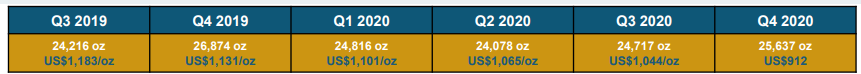 La producción de oro se ha mantenido estable durante los últimos seis cuadrimestres, en cada Q desde Q3 de 2019 hasta Q4 de 2020 se han producido cerca de 25.000 onzas.