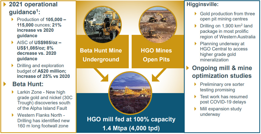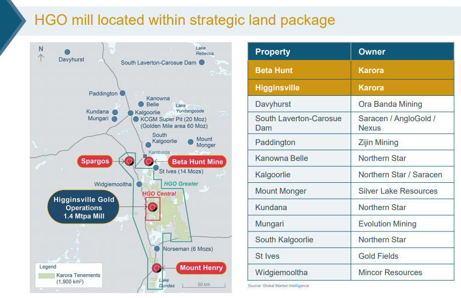 A partir del 2018 y con las cuentas recuperadas, Karora adquirió el 100% de Higginsville, aproximadamente 75 km al sur de Beta Hunt, operación con una planta para la producción de oro y 192 propiedades mineras.